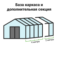 Длина базовой теплицы - 4,0 м., в комплекте: двойная дверь-купе и две форточки в крыше.